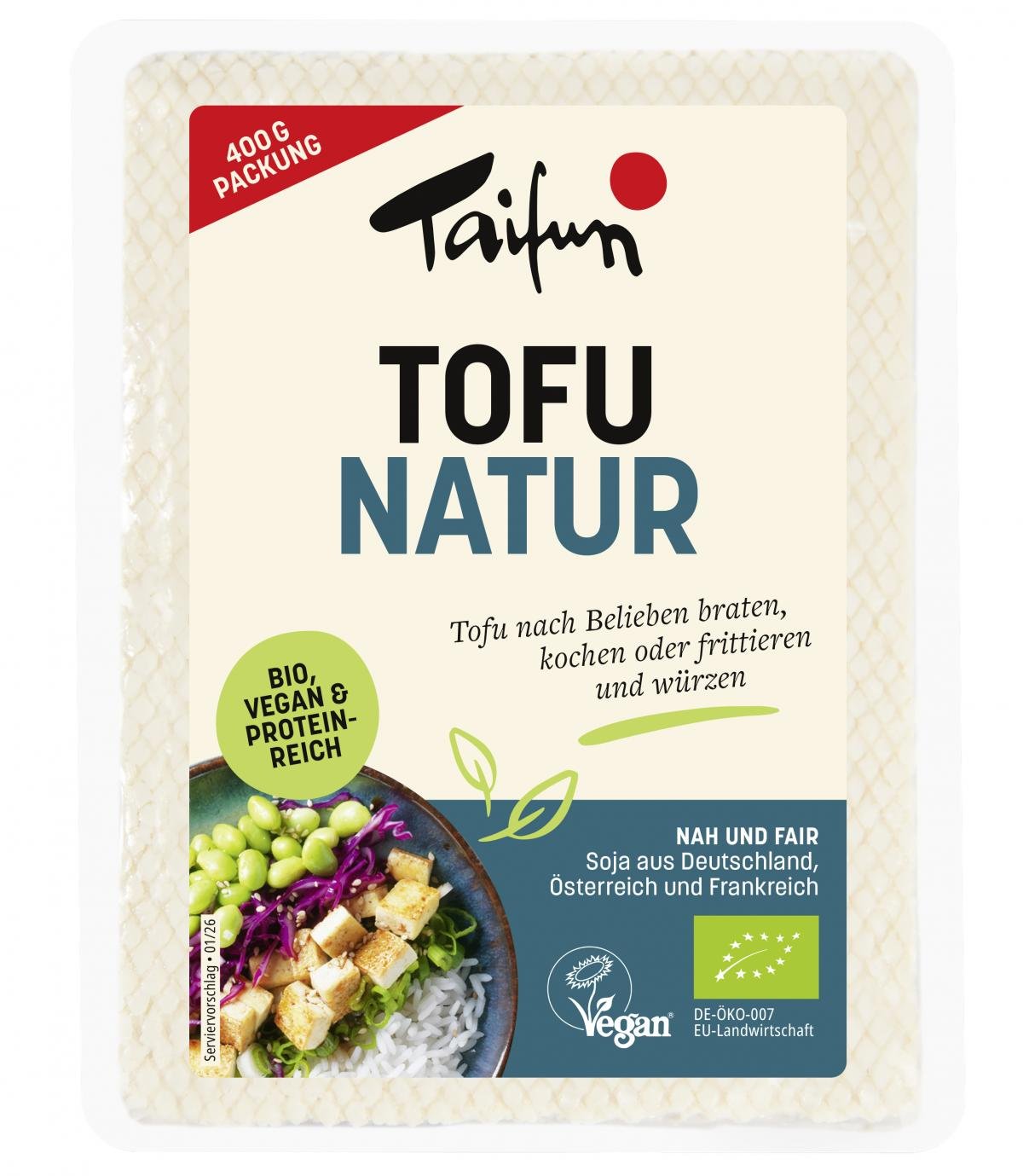 Bevor Sie den Tofu verarbeiten, tupfen Sie ihn mit einem Küchenpapier ab oder lassen Sie ihn längere Zeit abtropfen. Wenn Sie nicht das ganze Tofustück verarbeiten, legen Sie den zurückbehaltenen Tofu in eine Schale und bedecken Sie ihn vollständig mit frischem Wasser. So hält sich Ihr Tofu im Kühlschrank noch drei bis vier Tage frisch. Wasser täglich wechseln.